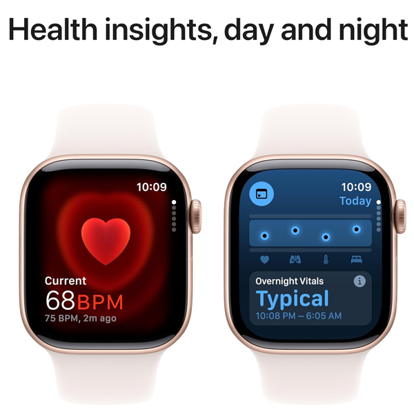 - ADVANCED HEALTH INSIGHTS — Take an ECG anytime.* Get notifications if you have high or low heart rate or an irregular heart rhythm.* Understand your menstrual cycle and get retrospective ovulation estimates.* See overnight health metrics like heart rate, respiratory rate, and more with the Vitals app.* Track sleep and get notifications if Apple Watch detects signs of sleep apnea.*